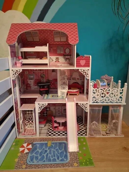 Domek dla lalek w doskonałym stanie. Idealny dla małych księżniczek, które lubią bawić się w dom. Wykonany z solidnych materiałów, zapewnia długotrwałą zabawę i kreatywność. Wyposażenie wliczone. Produkt używany.Katarzyna