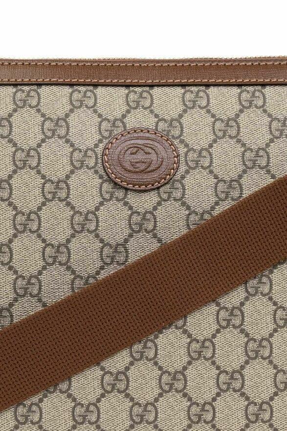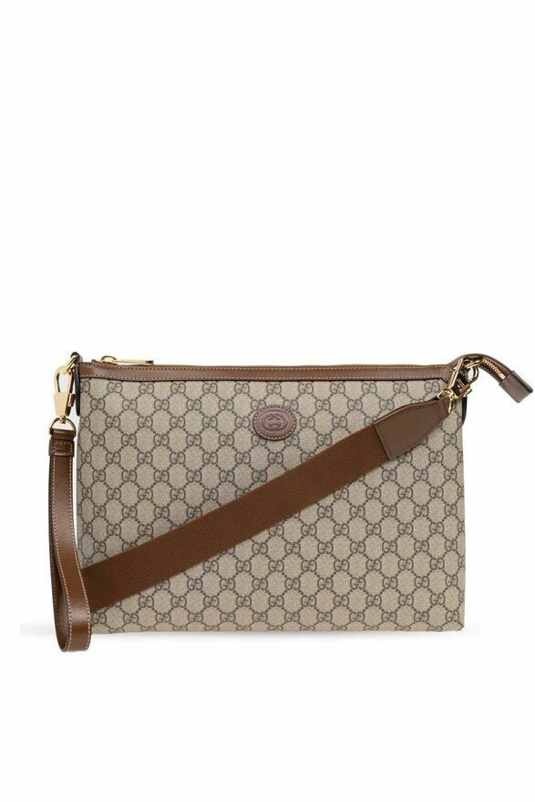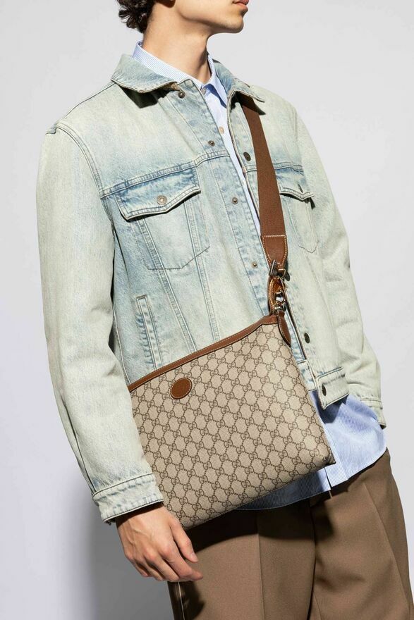 Prezentujemy Państwu wyjątkową torbę na ramię z monogramem od światowej sławy domu mody Gucci, będącą kwintesencją męskiej elegancji i funkcjonalności. Wyrafinowany beżowy odcień, dopełniony charakterystycznym wzorem monogramowym, otula zewnętrzną warstwę wykonaną z najwyższej jakości skóry cielęcej oraz płótna 'gg Supreme'. Ta kompozycja kolorystyczna i materiałowa czyni ją nie tylko przedmiotem praktycznym, ale i wyjątkowo stylowym dodatkiem.Torba zachwyca prostokątnym kształtem z subtelnie zaokrąglonymi rogami oraz płaską konstrukcją, co podkreśla jej nowoczesny charakter. Przód zdobi wąski, brązowy pas, akcentowany przez okrągły element, prawdopodobnie logo projektanta, co dodaje całości ekskluzywnego akcentu. Złote detale metalowe, w tym zasuwy na zamkach i klamry, są świadectwem dbałości o każdy, nawet najmniejszy szczegół.