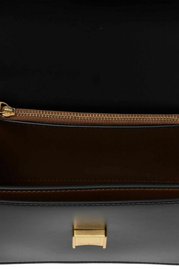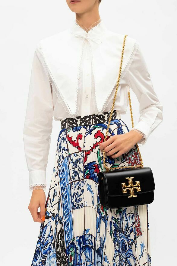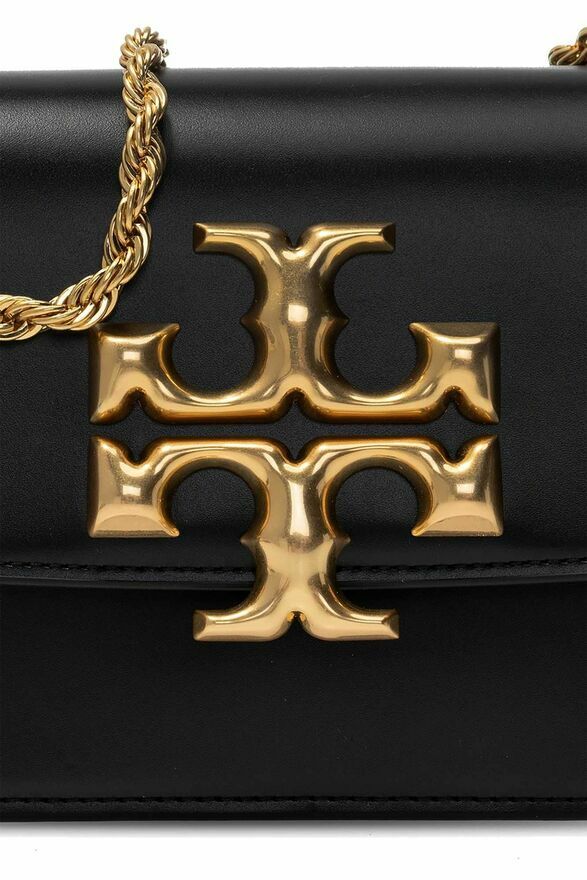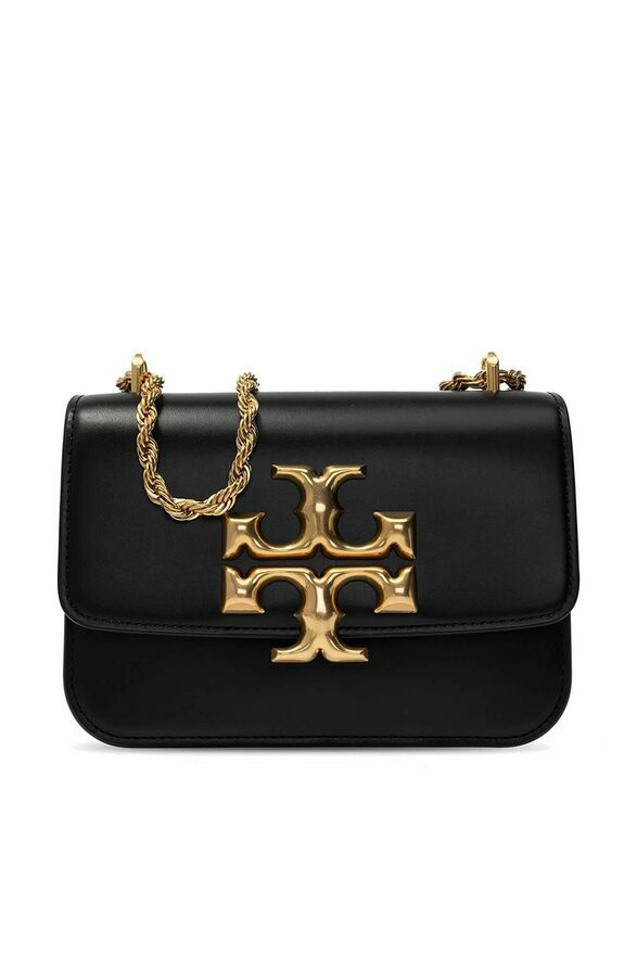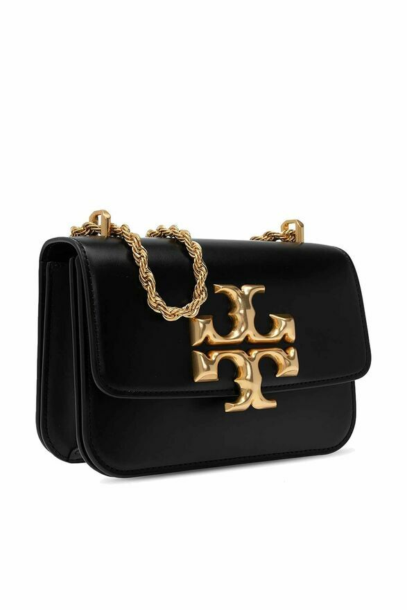 Czarna, skórzana torba na ramię, model ‘Eleanor’ Tory Burch, rozmiar ‘small’. Zamykana na magnetyczny zatrzask. Z przodu aplikacja z logo w kolorze złotym. Łańcuch na ramię, Brązowa warstwa wewnętrzna. Wewnątrz komora z wsuwaną kieszenią oraz kieszenią zamykaną na zamek.Skład / Pojemność