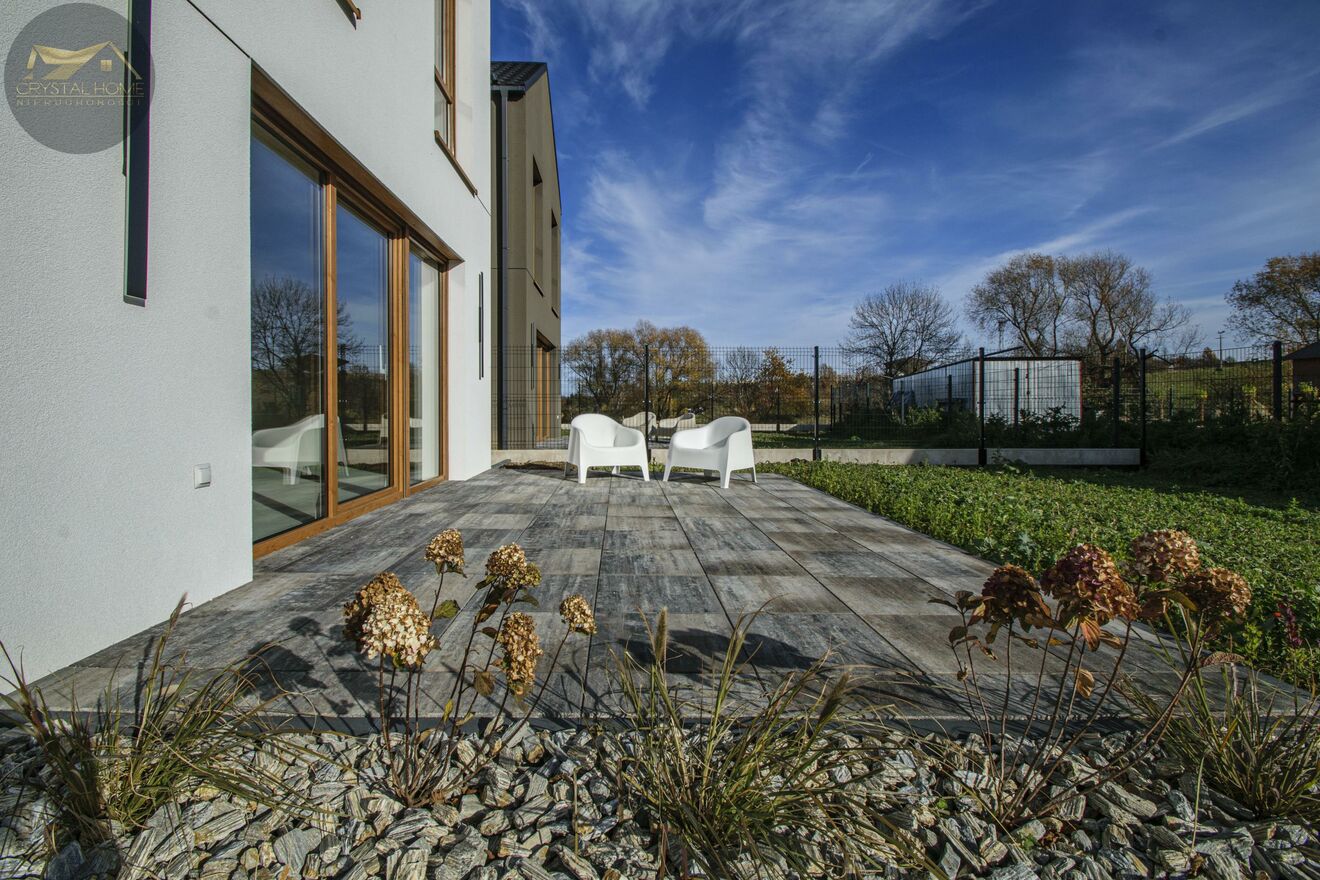 Do każdego lokalu przynależy ogród o powierzchni 230 m, który można zagospodarować według własnych potrzeb. Przed domem znajduje się podjazd z kostki betonowej z dwoma miejscami parkingowymi oraz wejściem do domu o łącznej powierzchni około 60 m.