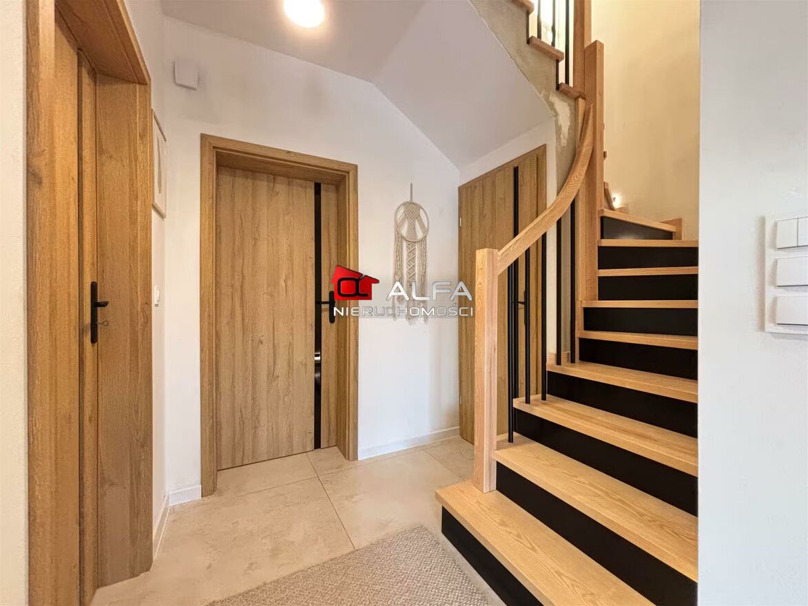 W domu są 3-szybowe okna PCV, przesuwne drzwi tarasowe - okna wyposażone w rolety elektryczne rolety zewnętrzne, schody z jesionu, na podłogach panele i płytki.