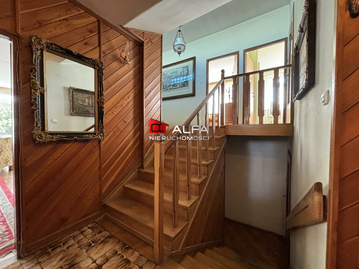 W domu są okna PCV, na podłogach drewniany parkiet oraz drewniane schody.