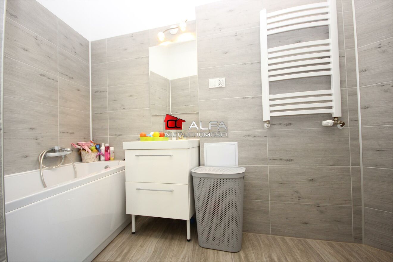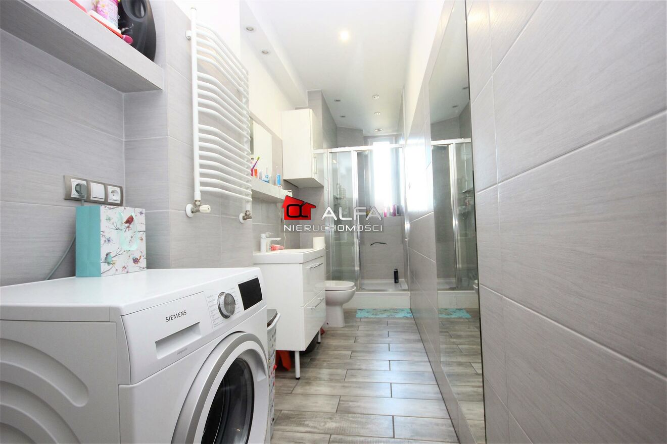 W cenie nieruchomości pozostaje kuchnia wraz ze sprzętem AGD, łazienki z umeblowaniem, szafa w zabudowie, regały w schowku.