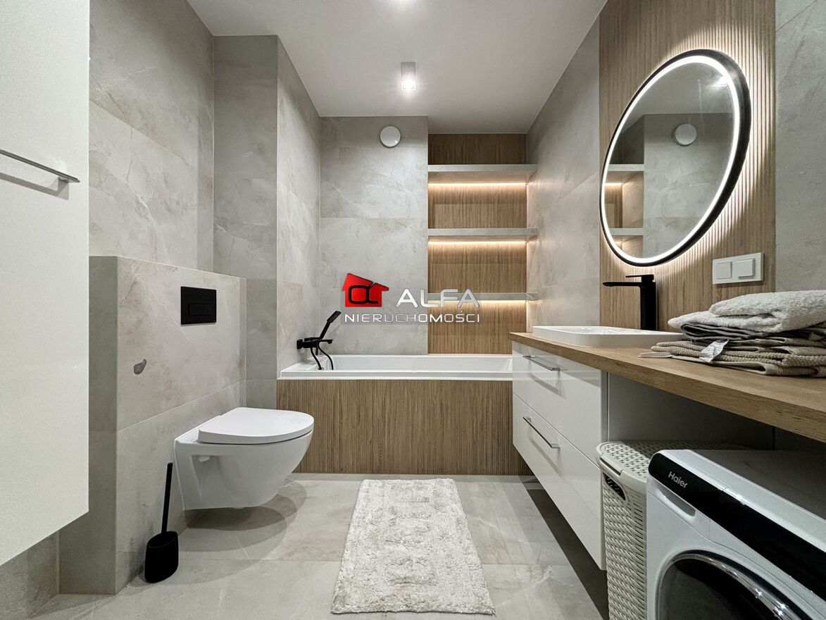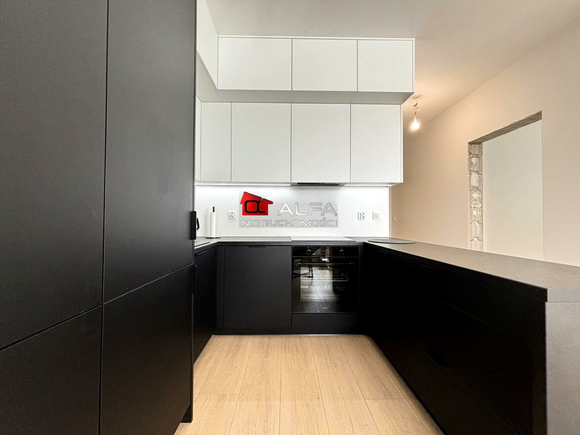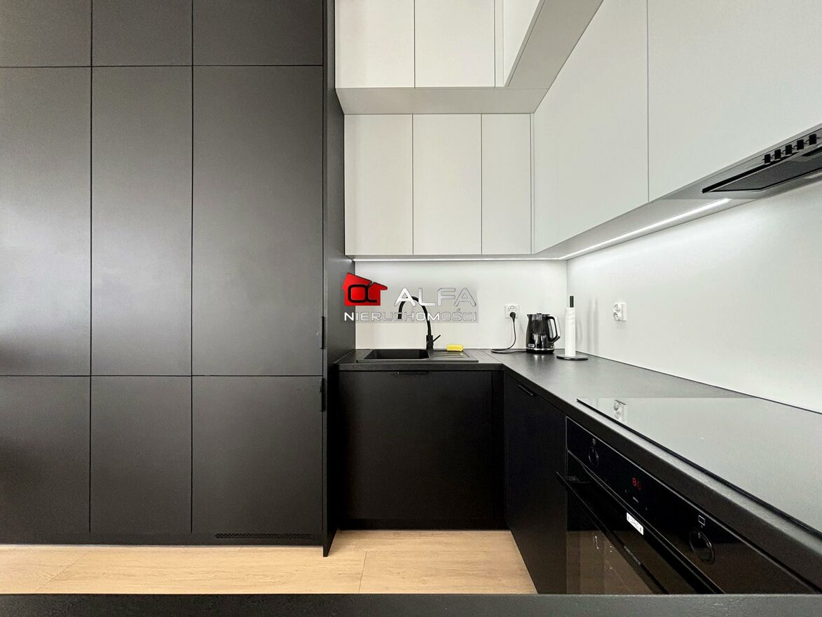 W kuchni znajdują się meble wykonane pod wymiar z wmontowanym oświetleniem ledowym pod szafkami, wyposażona w najlepszej jakości sprzęt AGD.