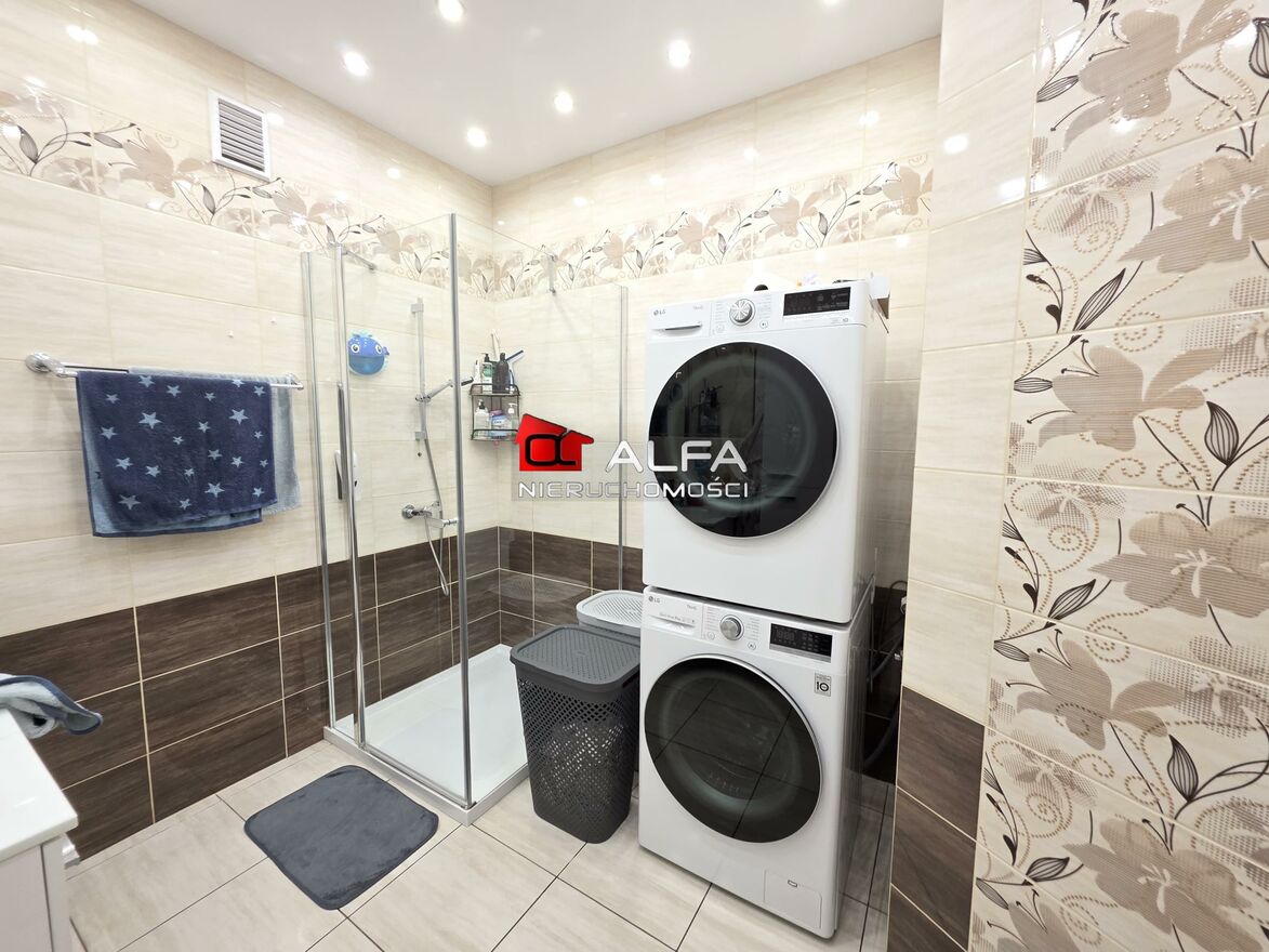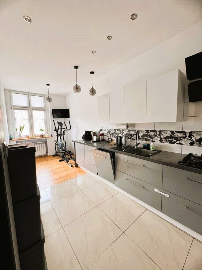 Kuchnia została wyposażona w nowoczesne meble w zabudowie oraz sprzęt AGD, co podnosi komfort codziennego użytkowania.