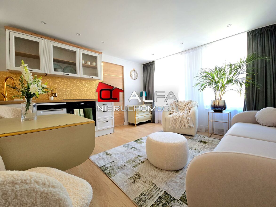 Mieszkanie w pełni umeblowane i wyposażone w sprzęt AGD: płyta, piekarnik, zmywarka, lodówka.