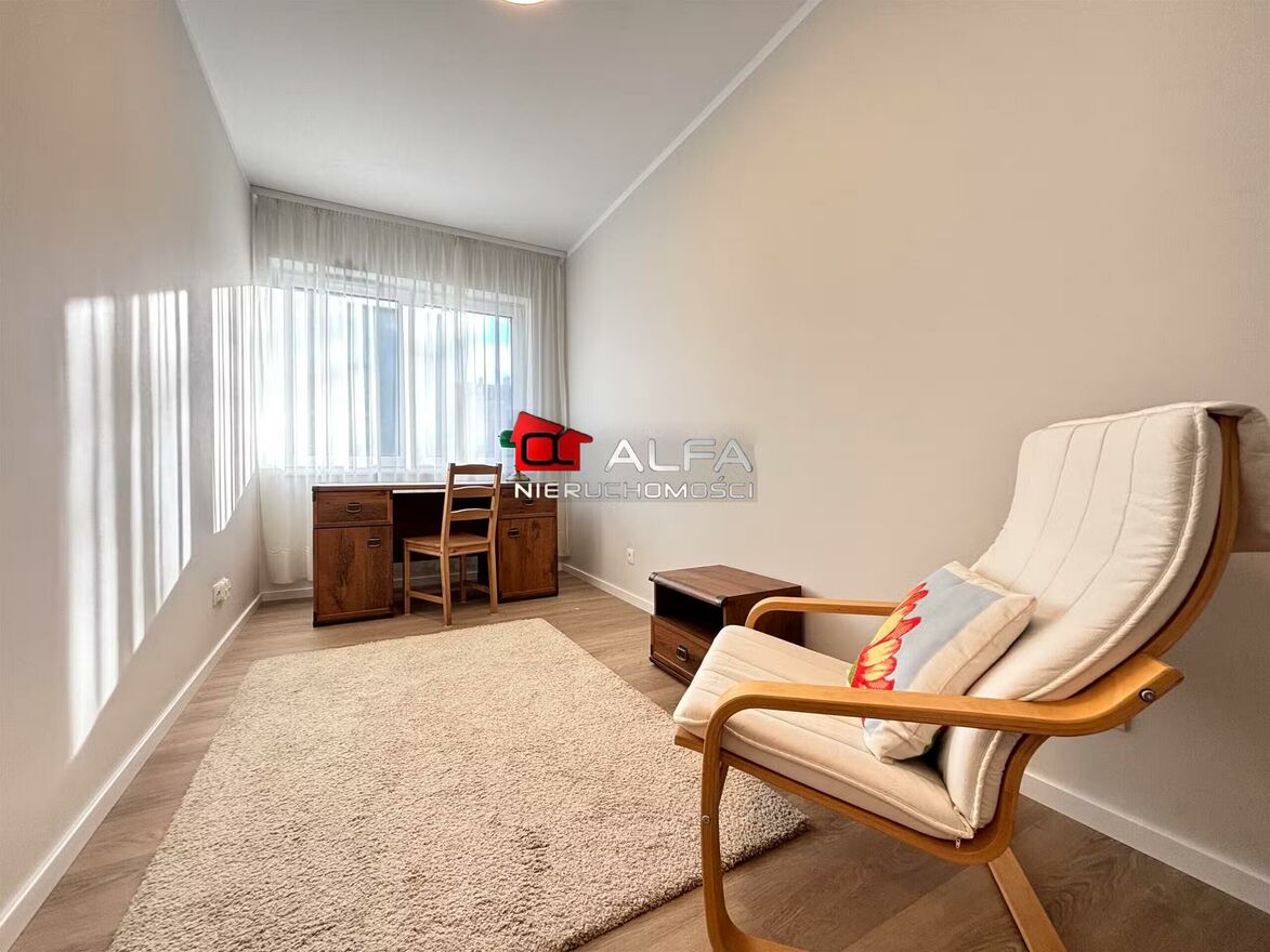Druga sypialnia wyposażona w biurko z krzesłem, fotel oraz komodę (idealne pomieszczenie na biuro lub gabinet).