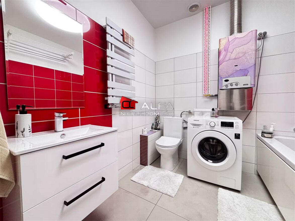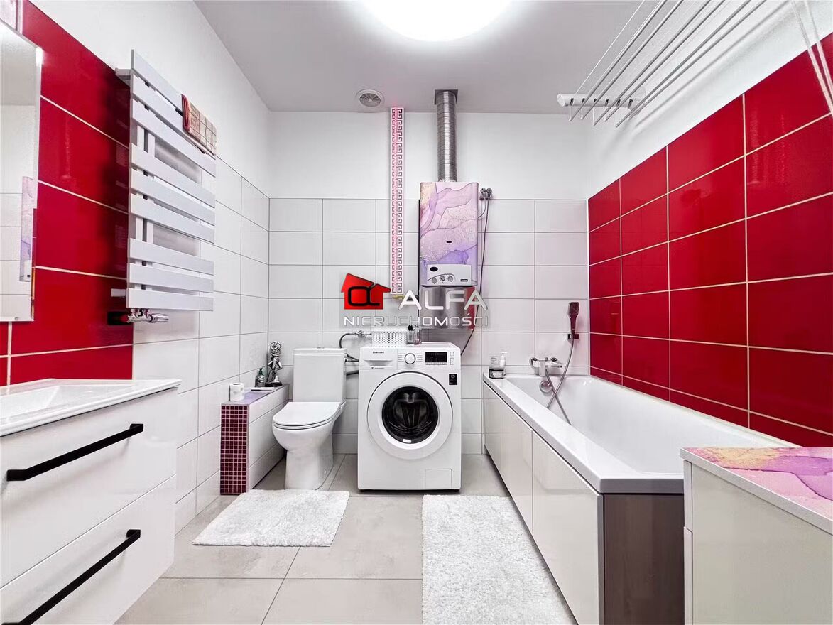 W cenie mieszkania pozostaje całe umeblowanie i wyposażenie w kuchni (oprócz lodówki), w łazience (oprócz pralki), w salonie narożnik oraz szafa i szafki w kolorze drewna.
