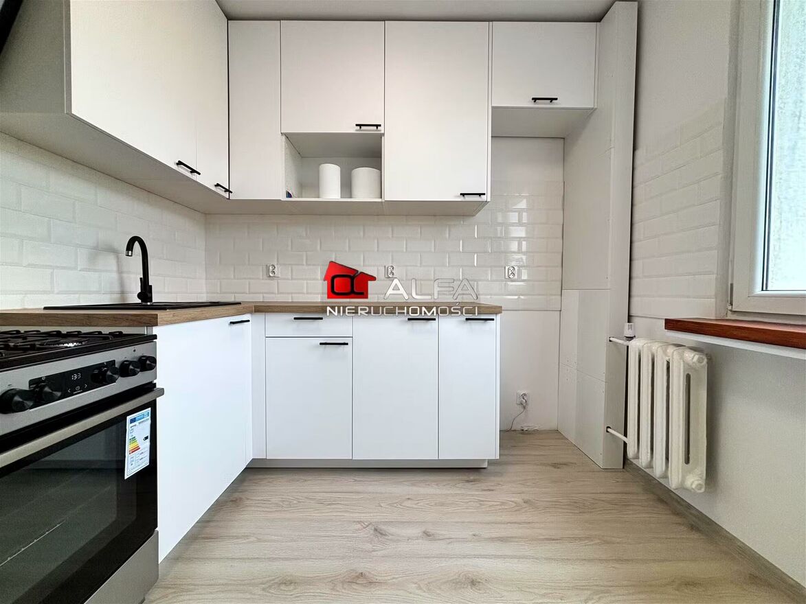 W cenie mieszkanie są nowe meble kuchenne z kuchenką oraz meble łazienkowe i szafka na wymiar w toalecie.