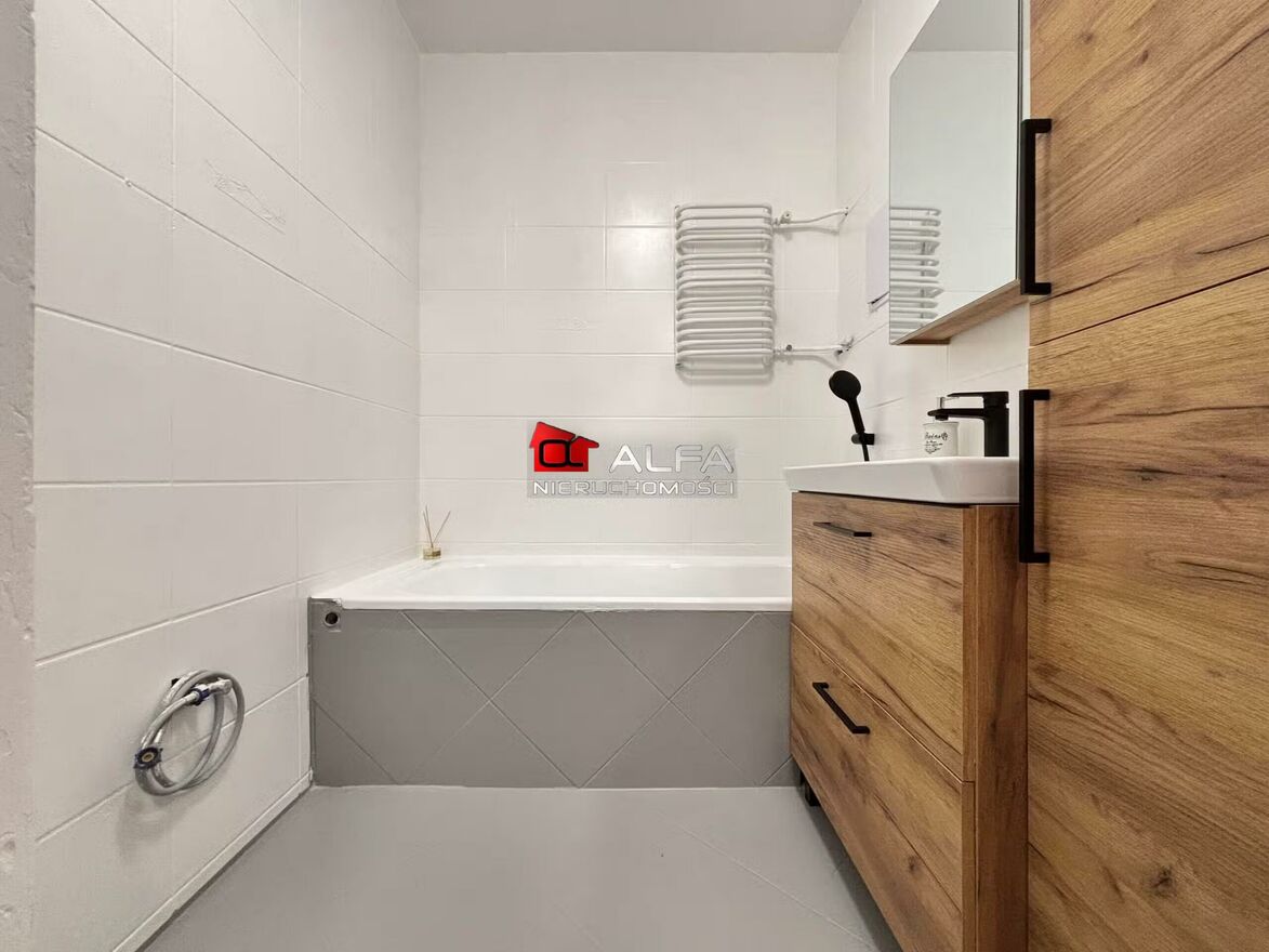 W cenie mieszkanie są nowe meble kuchenne z kuchenką oraz meble łazienkowe i szafka na wymiar w toalecie.