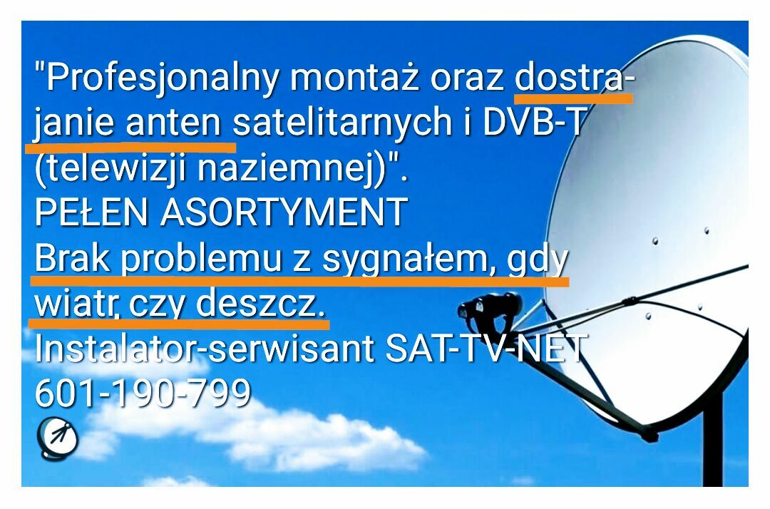 Zadzwoń 601 - pokaż numer telefonu - Profesjonalny montaż i oraz serwis, ustawienie i dostrajanie anten satelitarnych Cyfrowy Polsat BOX CANAL+ NC+ CYFRA+ i DVB-T2 telewizji naziemnej Pełen asortyment ZADZWOŃ 6.0.1.1.9.0.7.9.9Majsterek