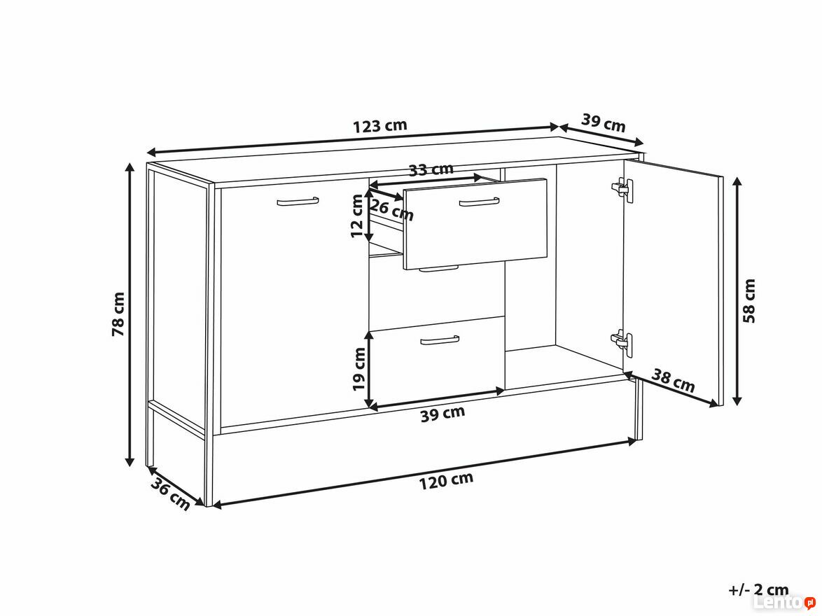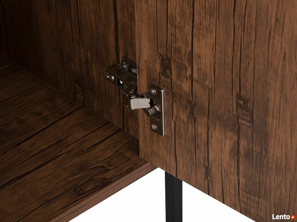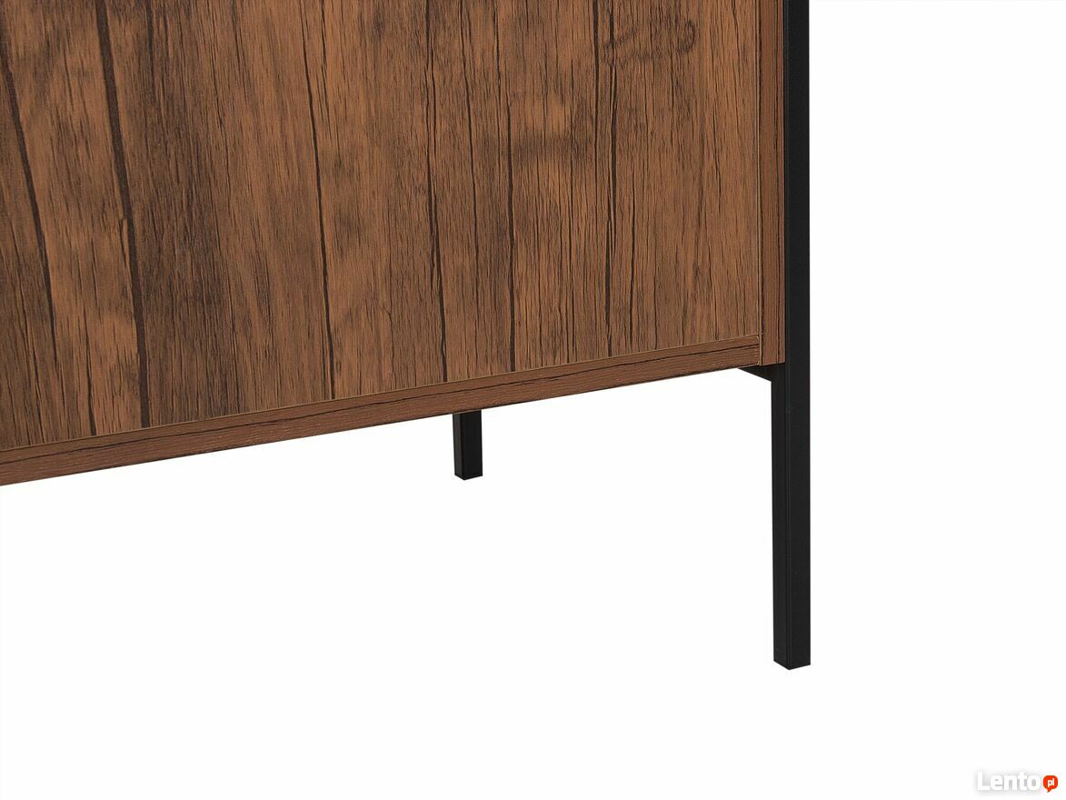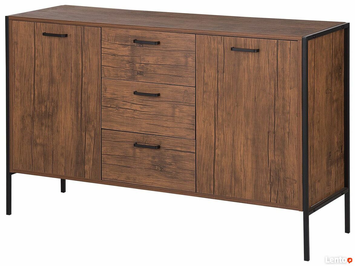Ta niewysoka komoda to uniwersalny mebel pasujący zarówno do salonu, jak i sypialni czy korytarza. Trzy głębokie szuflady i dwie zamykane szafki po bokach zapewniają mnóstwo miejsca do przechowywania. Elegancki ciemny kolor i struktura słojów naturalnego drewna świetnie współgrają z metalowymi nóżkami i ramą, tworząc całość w industrialnym stylu.Szczegóły